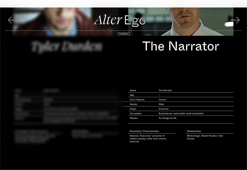 The site is always divided in half - showcasing either the ego or the alter, 2 entities that coexist and redefine the true individual. In every person's inner page, the “me” and “the other”, the man and its persona - both always present, but only one is in focus.